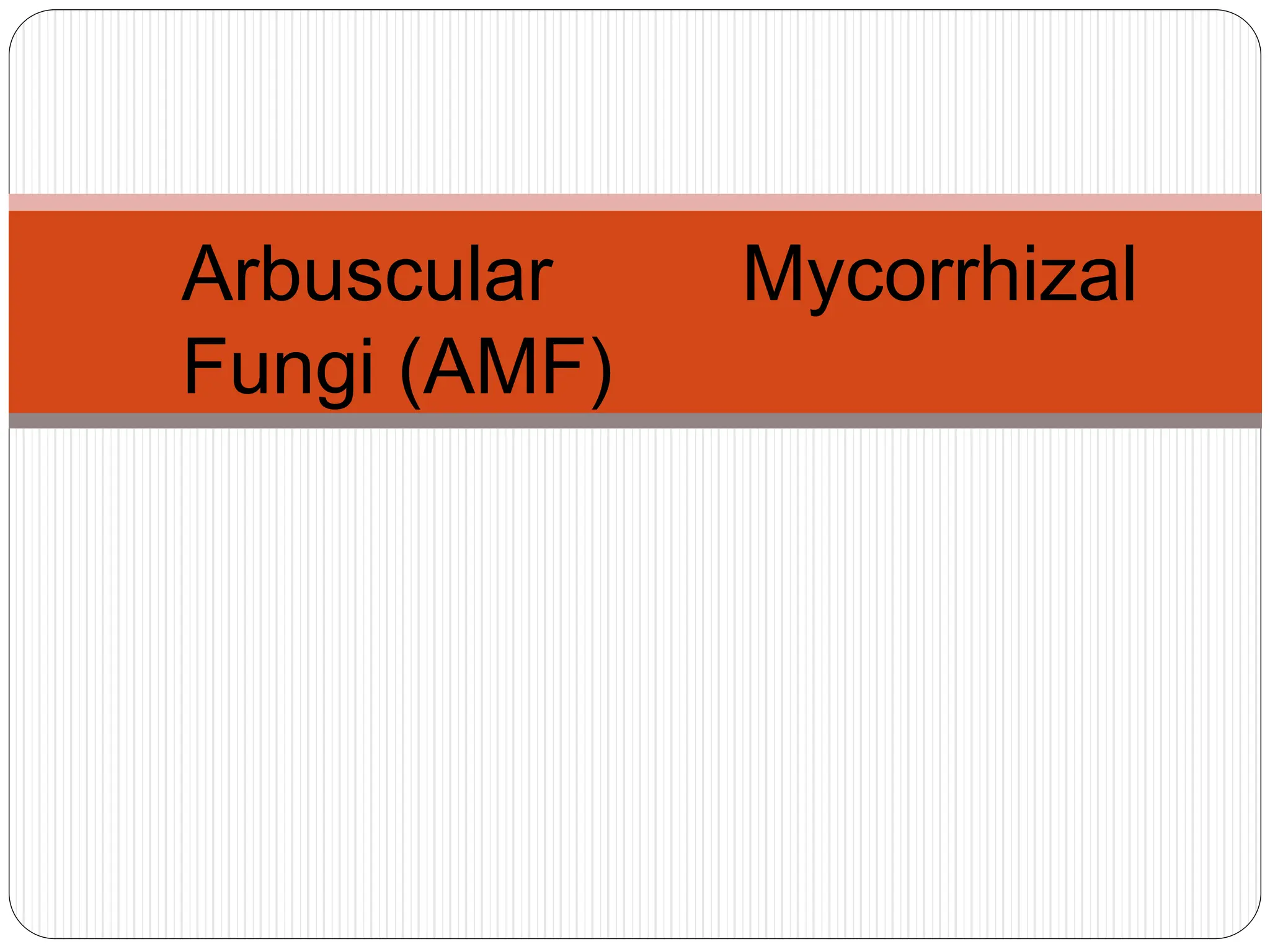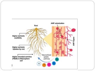 Arbuscular mycorrhizal fungi (AMF) are a group of root-obligate biotrophs that form symbiotic relationships with about 80% of plants. They act as natural biofertilizers by providing host plants with water, nutrients, and pathogen protection in exchange for photosynthetic products. AMF constitute a type of beneficial fungus that colonizes plant roots and increases absorption of phosphorus and other nutrients from soil, supporting plant growth and increasing crop yields. They function as biofertilizers in this way.