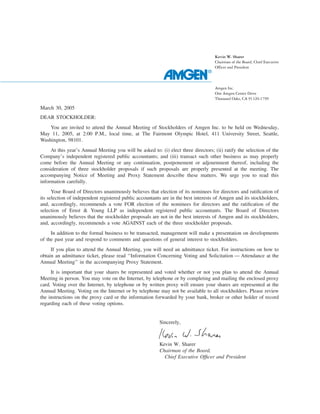 1. The document is a letter from Kevin W. Sharer, Chairman and CEO of Amgen Inc., informing stockholders about the upcoming Annual Meeting of Stockholders on May 11, 2005. 2. At the Annual Meeting, stockholders will vote on electing three directors, ratifying the selection of the independent accountants, and three stockholder proposals. 3. The Board recommends voting for the election of directors and ratification of the accountants, and against the three stockholder proposals. Stockholders are urged to vote by proxy, mail, internet or telephone in advance of the meeting.