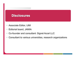 The document discusses Peter Embi's approach to presenting on clinical and translational research informatics literature from the past year. It provides an overview of Embi's search strategy and categorization of papers, which involved searching literature databases and recommendations from colleagues. The presentation will focus on summarizing representative papers within categories like data sharing/reuse, methods and systems, recruitment and eligibility, and trends in clinical research informatics.