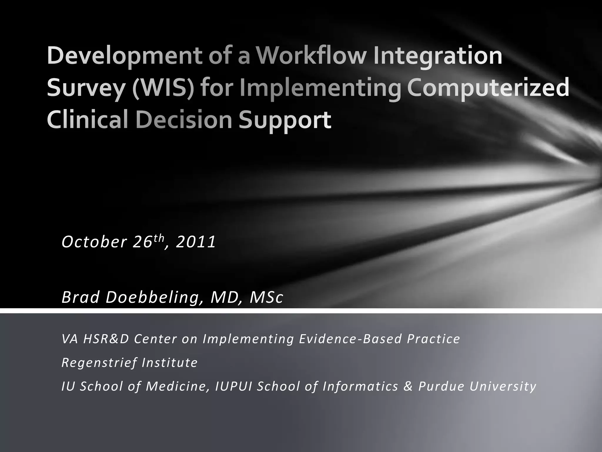 This document details a study on integrating computerized clinical decision support (CDS) into healthcare workflows, emphasizing the importance of seamless integration for improving clinical decision-making and adherence to evidence-based guidelines. The study included qualitative observations and surveys assessing barriers and facilitators of CDS integration across various healthcare institutions, leading to the development of a validated workflow integration survey. Initial results indicate that enhanced CDS versions significantly improve usability, functionality, and overall workflow efficiency in clinical settings.