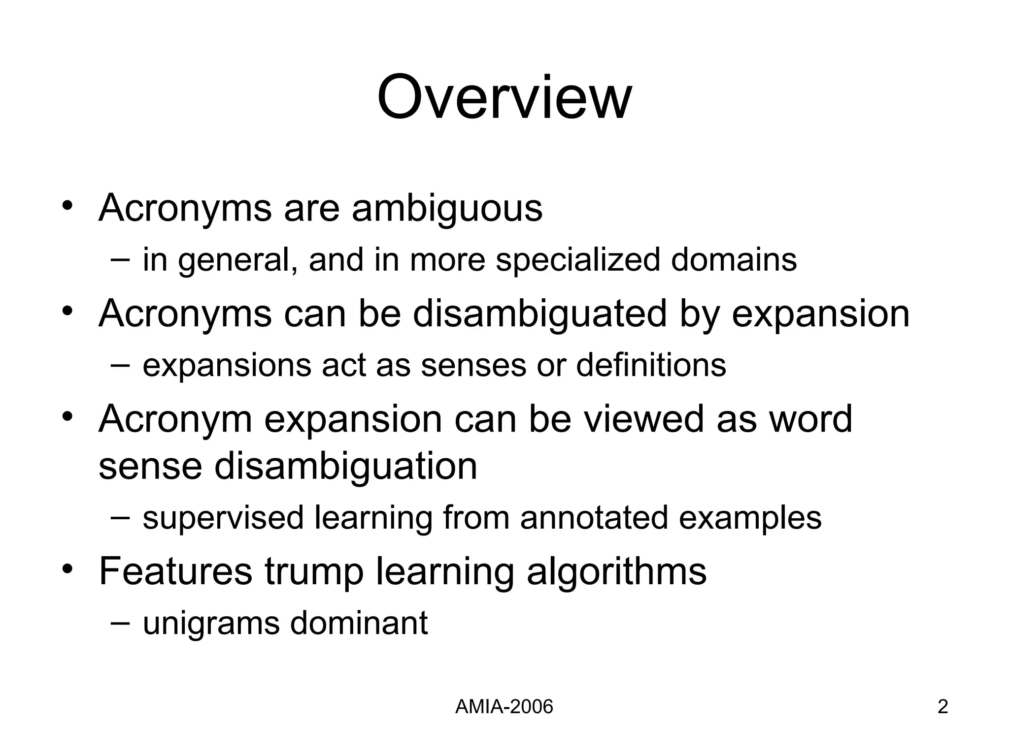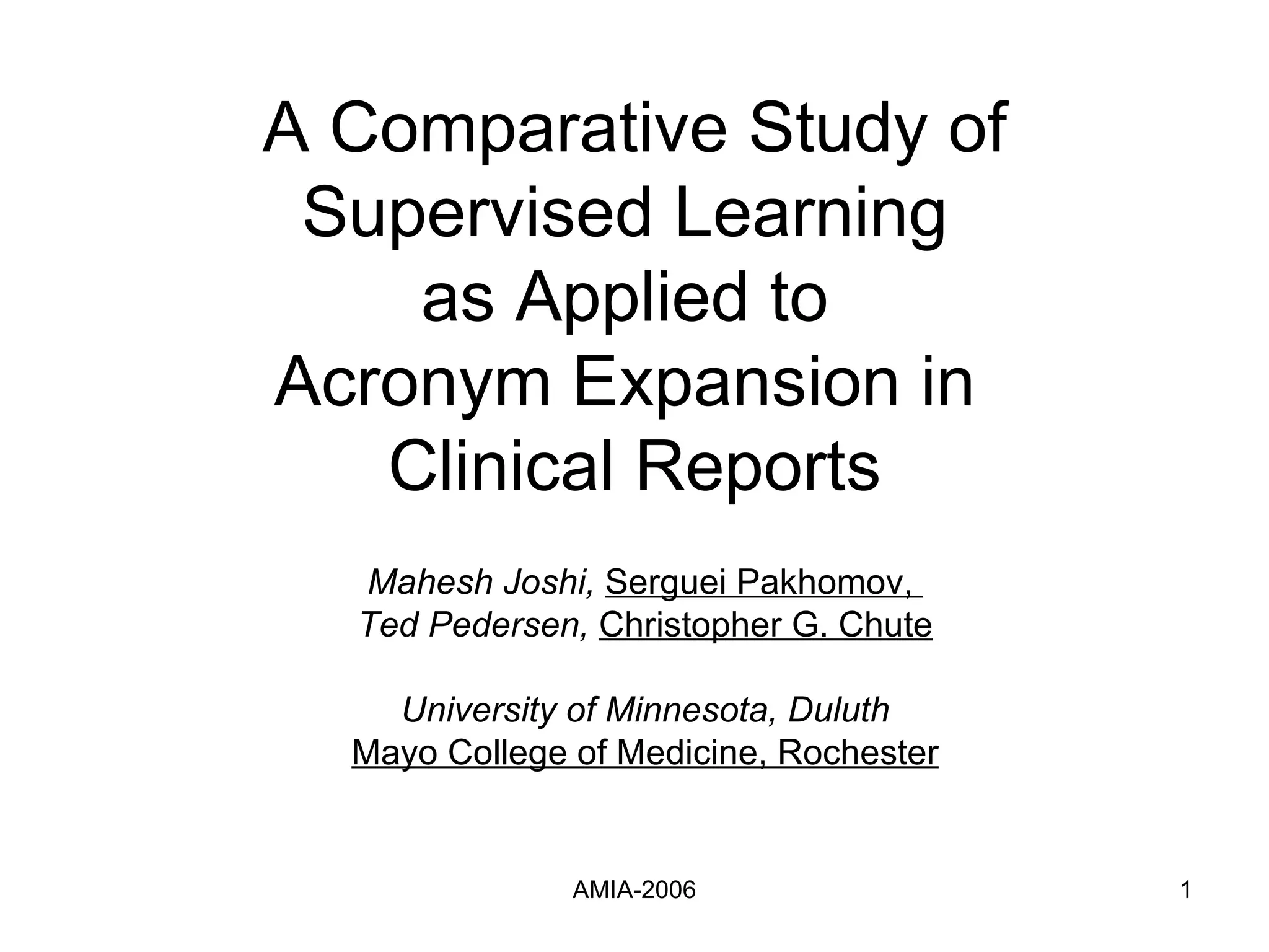 The document summarizes a study that compares supervised learning methods for expanding acronyms in clinical reports. It finds that naïve Bayesian classifiers, decision trees, and support vector machines can expand acronyms with over 90% accuracy. Unigrams are the most important features for the task. Considering a flexible window of text around acronyms improves performance over a fixed window.
