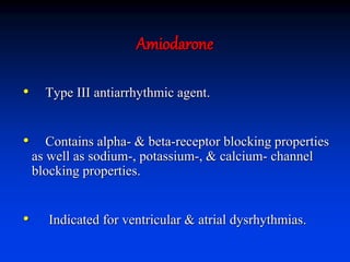 - Amiodarone is a class III antiarrhythmic agent with alpha, beta, sodium, potassium, and calcium channel blocking properties. It is indicated for ventricular and atrial dysrhythmias.