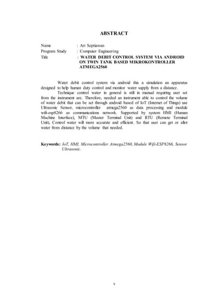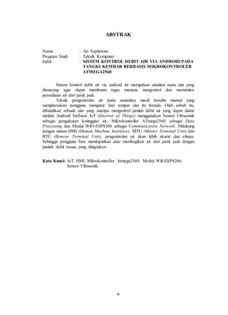 Dokumen ini merupakan abstrak dari skripsi tentang sistem kontrol debit air menggunakan android berbasis mikrokontroler ATmega2560, sensor ultrasonik, dan modul WiFi-ESP8266 untuk memantau dan mengontrol persediaan air dari jarak jauh secara lebih akurat dan efisien.