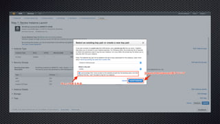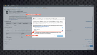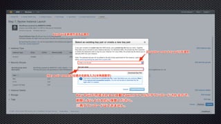 chmod 600 Downloads/jawsdays2015.pem 2、サーバへsshで接続 ssh -‐i Downloads/jawsdays2015.pem ec2-‐user@xxx.xxx.xxx.xxx Windowsユーザ 1、teratermをダウンロード h-p://www.forest.impress.co.jp/library/soGware/uR8teraterm/ 2、teratermを起動してサーバへsshで接続 ホストにインスタンスのIPアドレスを入力して「OK」をクリック。 ユーザ名に「ec2-‐user」、パスフレーズは空欄、「RSA/DSA鍵を使う」にチェックをして、 秘密鍵ボタンをクリックして、インスタンス作成時にダウンロードした鍵をセット。 OKをクリックすると接続できる。
