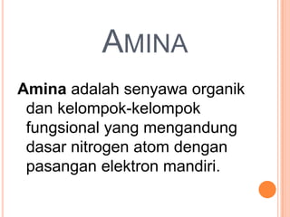 Dokumen ini membahas tentang senyawa amina, termasuk klasifikasi, sifat fisik, dan kegunaannya sebagai katalisator serta dalam berbagai aplikasi, seperti pelarut dan pembuat sabun. Selain itu, dijelaskan juga metode pembuatan amina dan reaksi yang dilakukan untuk membedakan jenis amina. Amina memiliki sifat beracun dan dapat diabsorpsi oleh kulit.