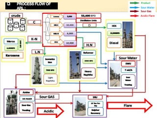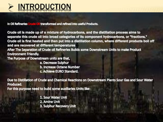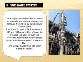 The document provides a comprehensive overview of the Sour Water Stripping Unit (SWU) and the Amine Unit, detailing their processes, instrumentation, and purpose. It outlines the removal of toxic components like hydrogen sulfide (H2S) and ammonia (NH3) from sour water and gas, as well as the modifications and equipment used in both units. Additionally, it includes specific details on various control systems and gas detection technologies employed to ensure safety and efficiency.