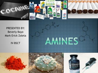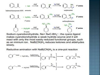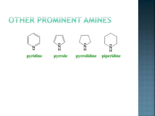 This document discusses amines, which are organic compounds derived from ammonia that contain a basic nitrogen atom. It describes different types of amines including primary, secondary, tertiary, aliphatic, aromatic, and cyclic amines. Methods for synthesizing amines are also summarized, including nucleophilic substitution reactions, reduction of nitrogen-containing functional groups, reductive amination, and the Hoffmann elimination reaction. Specific examples of important amines and their synthesis are provided.