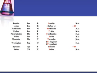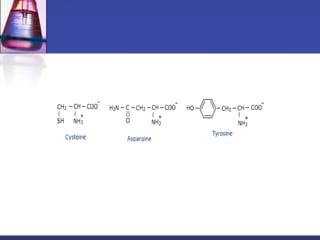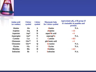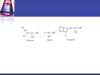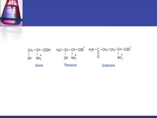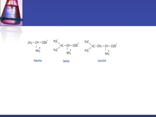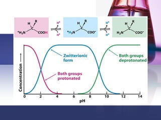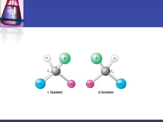This document discusses amino acids, which are the building blocks of proteins. It defines amino acids as molecules containing both carboxyl and amine groups. There are over 300 amino acids found in nature, but only 22 are used as the standard building blocks in proteins. These standard amino acids differ in the side chain (R group) attached to their alpha carbon. Amino acids join together via peptide bonds to form protein chains. Proteins are essential to all living organisms and are formed through the process of translation.