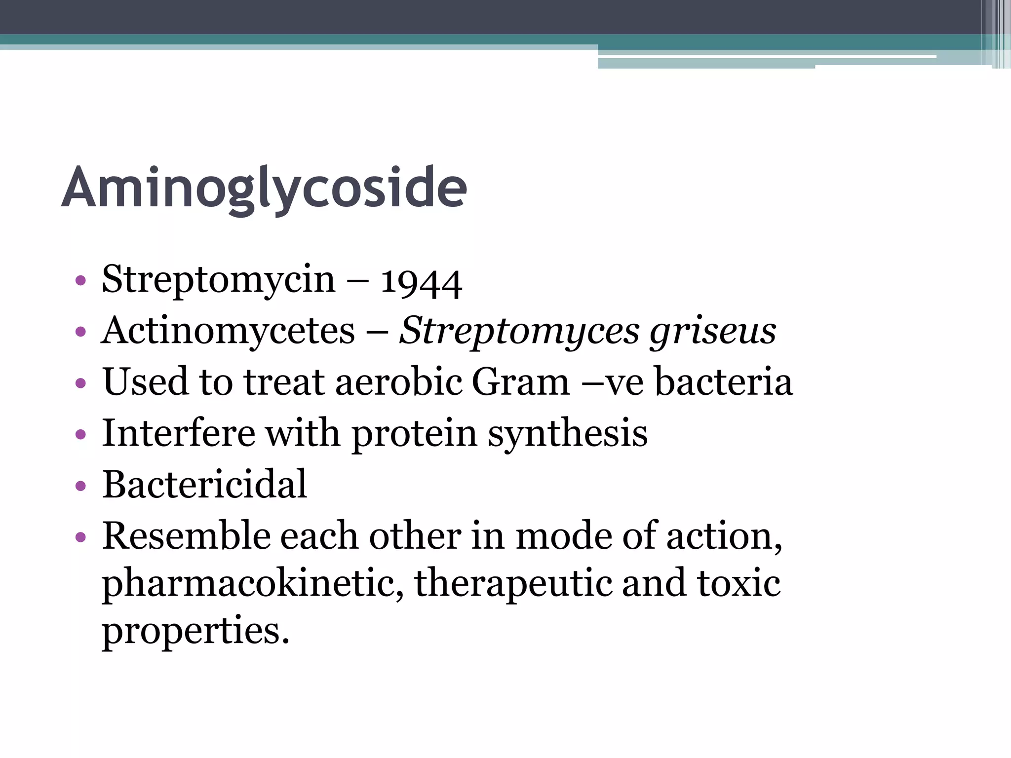 Aminoglycosides are a class of antibiotics that were first discovered in 1944 and are produced by actinomycetes bacteria. They work by interfering with bacterial protein synthesis and are bactericidal. They are narrow spectrum and primarily effective against gram-negative bacteria. Common examples include streptomycin, neomycin, kanamycin, and gentamicin. While effective antibiotics, aminoglycosides have the drawbacks of nephrotoxicity, ototoxicity, and rapid development of bacterial resistance. Their use requires monitoring of dosages and risks.