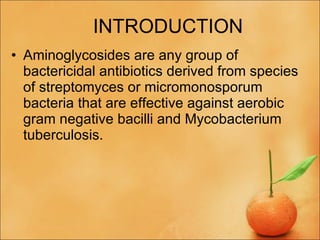 Aminoglycosides are a group of bactericidal antibiotics derived from bacteria that are effective against aerobic gram-negative bacilli and Mycobacterium tuberculosis. They work by inhibiting bacterial protein synthesis. Common aminoglycosides include amikacin, gentamicin, and streptomycin. They are used to treat serious gram-negative infections, tuberculosis, infectious diarrhea, and endocarditis prophylaxis. Nurses monitor patients for side effects like ototoxicity and nephrotoxicity and ensure adequate hydration during treatment.