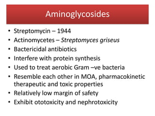 1. Aminoglycosides are a class of bactericidal antibiotics that interfere with protein synthesis in bacteria. They are effective against many gram-negative aerobic bacteria.