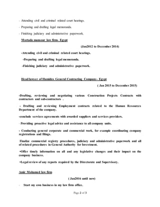 Amir Mohamed is a senior Egyptian lawyer with over 8 years of experience in civil, criminal, and personal status law. He has worked at several law firms in Egypt advising on contracts, corporate transactions, and litigation. Currently, Amir runs his own law firm focusing on advocacy, contract editing and review, and business registrations. He is fluent in Arabic and English and holds a law degree from Alexandria University.