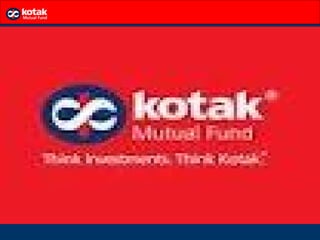 Kotak Mutual Fund is a leading mutual fund provider in India that is a subsidiary of Kotak Mahindra Bank. It offers a variety of equity, debt, balanced, and other funds that invest across different asset classes and sectors. The document discusses Kotak Mutual Fund's history, products, competitors, strengths such as size and performance, weaknesses such as manager changes, opportunities like emerging markets, and threats such as rising interest rates. It also covers the advantages of diversification and professional management that mutual funds provide investors.