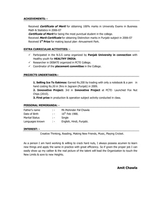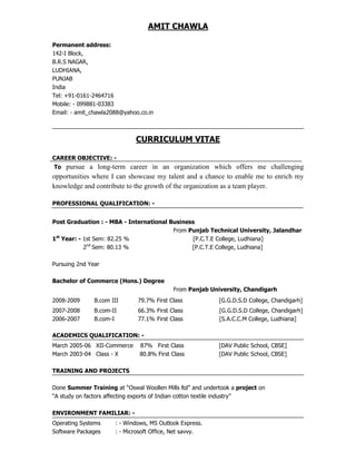 Amit Chawla is seeking a career opportunity that offers challenges and growth. He has an MBA in International Business and a B.Com degree. He is proficient in English, Hindi and Punjabi. He has work experience in sales and operations from internships. He enjoys creative thinking, reading, music and sports. He aims to contribute effectively to an organization's success through hard work and learning.