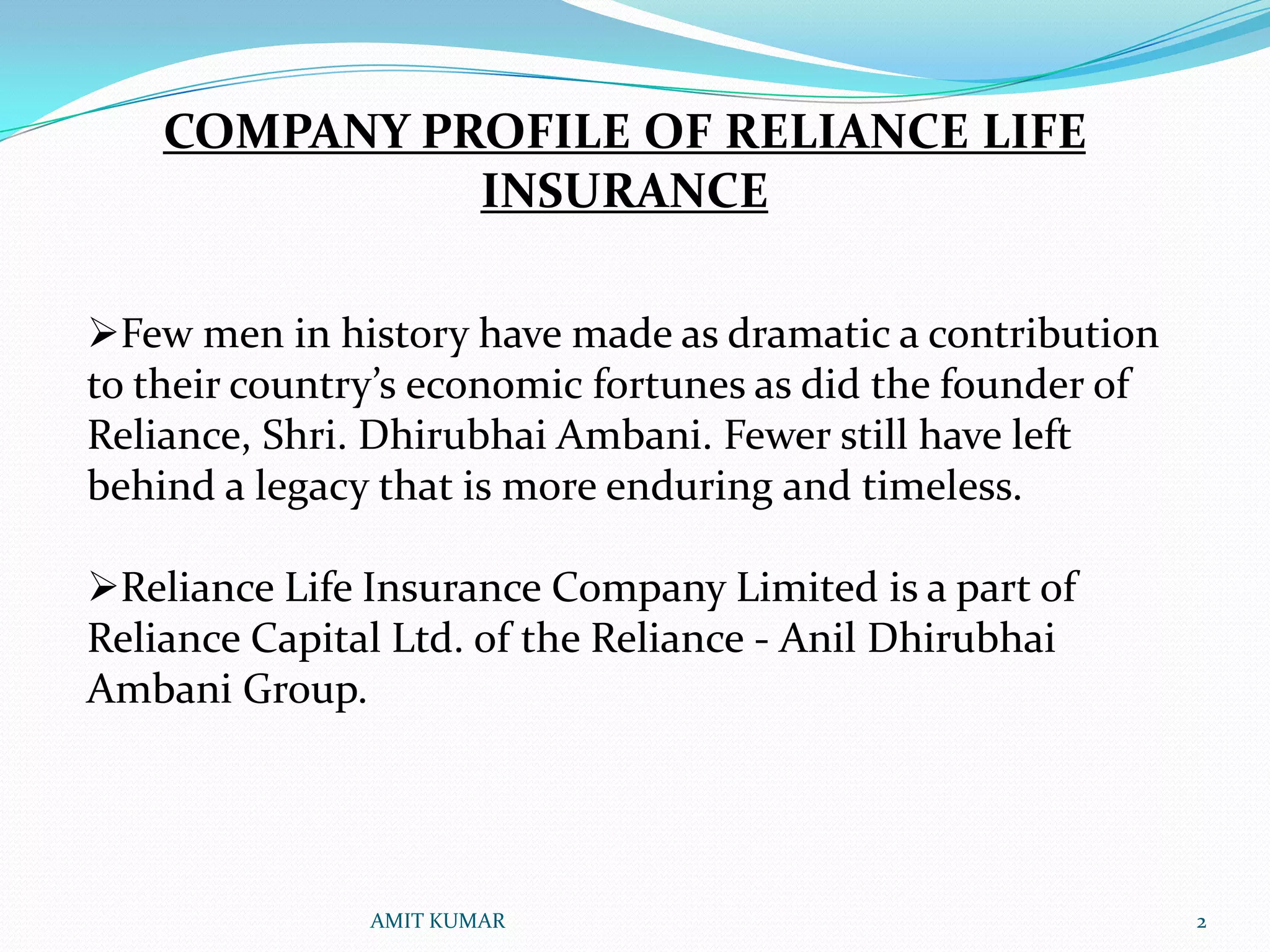Reliance Life Insurance is a part of Reliance Capital Ltd, which is one of India's leading private sector financial services companies. Reliance Life Insurance's mission is to help customers manage their financial future. It offers various individual and group insurance plans, including savings, pension, investment, and risk plans. Some of its major competitors in the Indian insurance industry include LIC, HDFC Standard Life Insurance, Max New York Life Insurance, and ICICI Prudential Life Insurance.