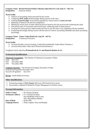 This document contains the resume of Amit Kumar Sarda. It summarizes his professional experience working as an Assistant Manager for Max Hypermarket India Pvt. Ltd., as a Financial Analyst for Hewlett Packard Global e Business Operation Pvt. Ltd., and as a Commercial Executive for Future Value Retail Ltd. It also lists his qualifications as a Chartered Accountant and Company Secretary as well as his personal details.