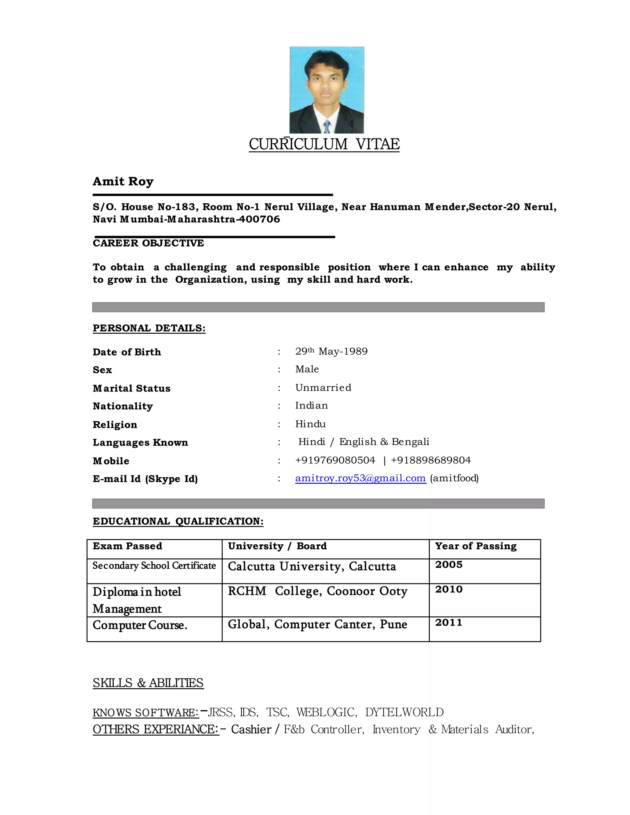 This document is a curriculum vitae for Amit Roy. It provides his personal details such as date of birth, education qualifications including a diploma in hotel management. It outlines his professional experience working in purchasing and inventory roles for various hospitality companies in India and Dubai from 2008 to the present. His responsibilities have included maintaining purchase and inventory records, receiving goods, forecasting demand, and building supplier relationships.