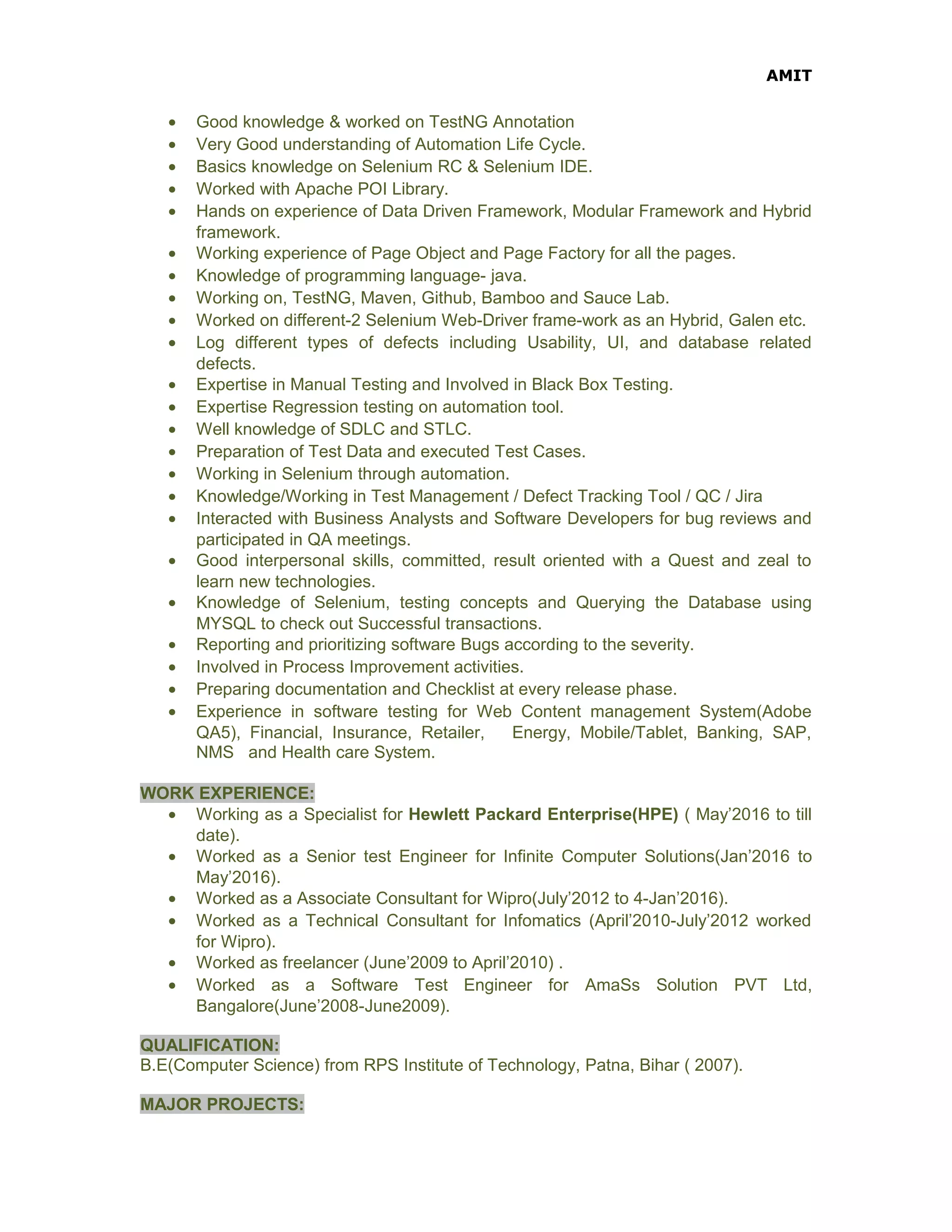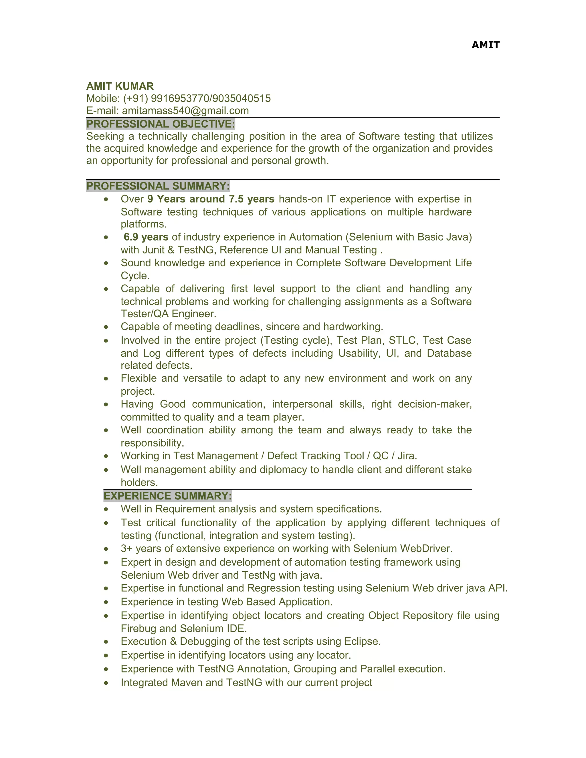 Amit Kumar provides a summary of his professional experience as a software tester. He has over 9 years of experience in software testing techniques using various applications on multiple hardware platforms. He has extensive experience with test automation using Selenium with Java, as well as manual testing and involvement across the entire software development life cycle. He also has experience working with defect tracking tools like Jira and test management tools like QC.