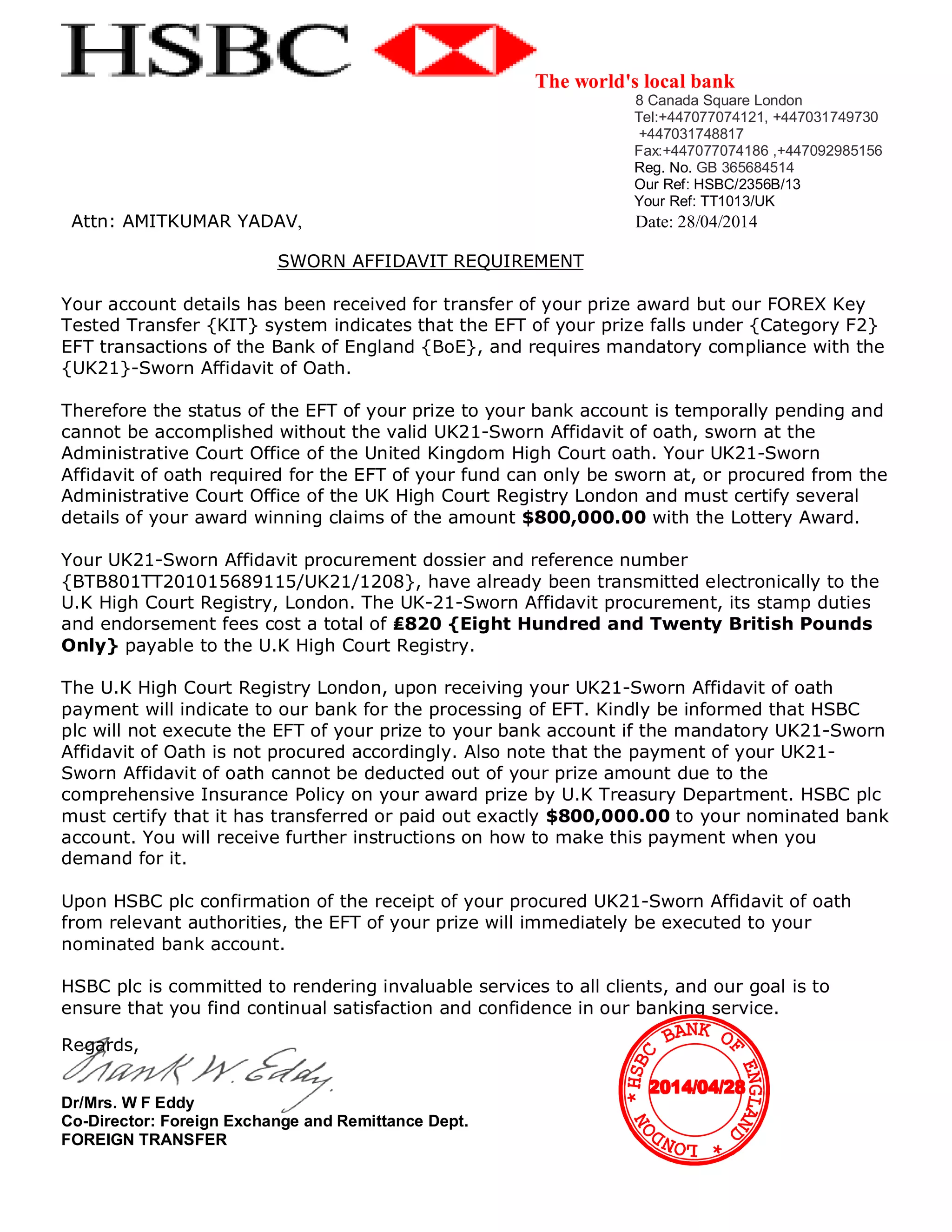 1) The document is a letter from HSBC bank informing the recipient that their $800,000 prize payment requires a sworn affidavit due to UK banking regulations.