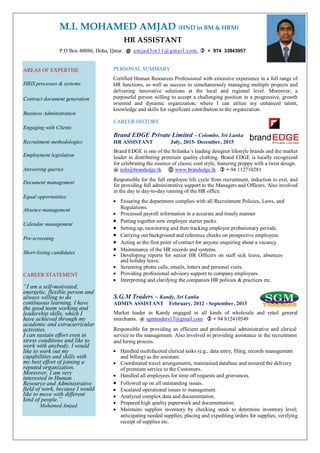 This document provides information about an individual's qualifications and experience for a human resources or administrative role. It includes sections summarizing their education in business management and human resources, work history in HR and administrative assistant positions, skills related to HR, administration, and personal attributes, and additional details like references and personal information.