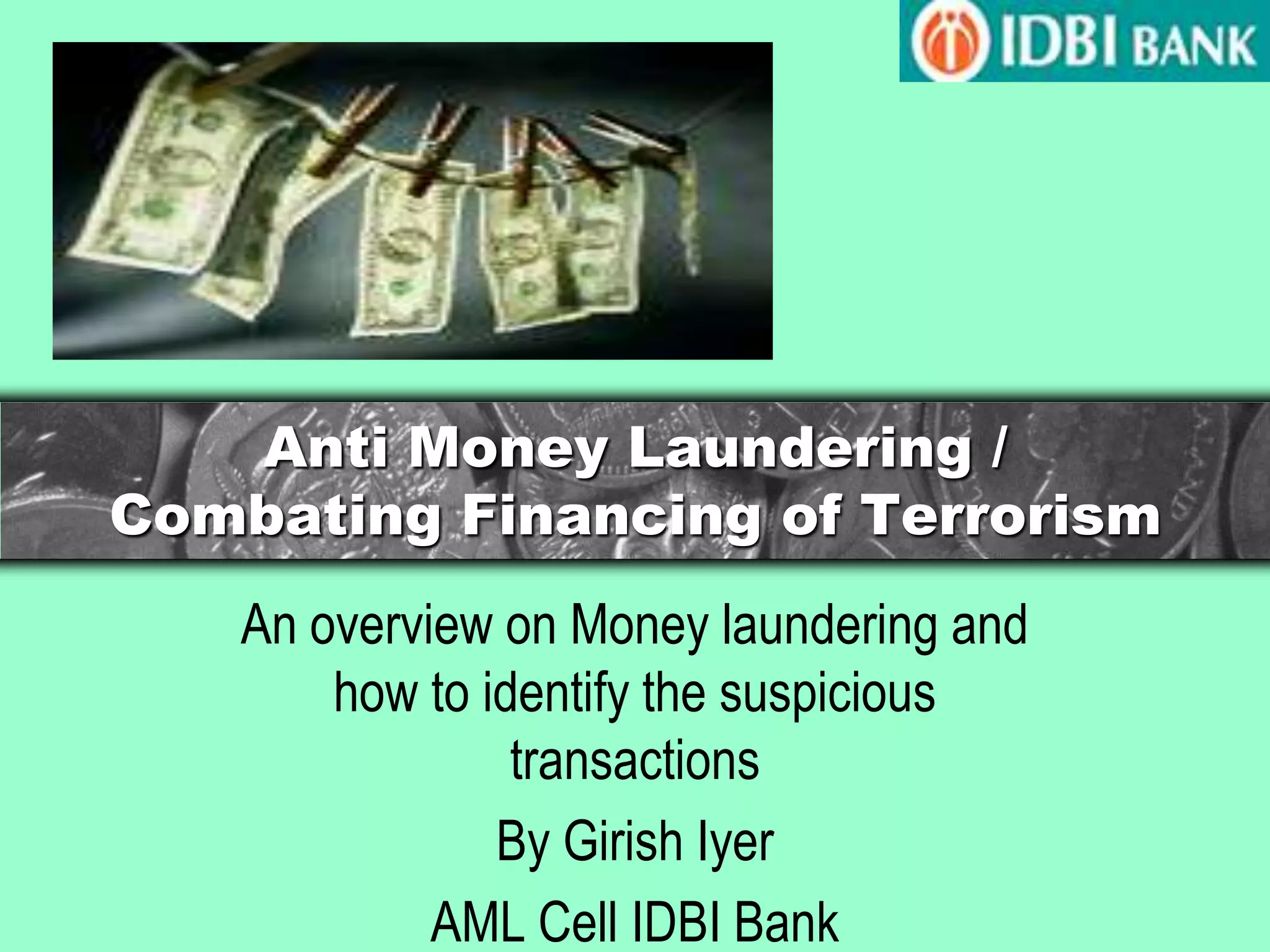 This document provides an overview of money laundering and combating the financing of terrorism. It discusses what money laundering is, the stages of money laundering (placement, layering, integration), and how it works. It also discusses terrorist financing. International efforts to combat money laundering and terrorist financing through organizations like the UN, FATF, and Egmont Group are overviewed. The roles and functions of India's Financial Intelligence Unit (FIU-IND) are described. The document also outlines India's Prevention of Money Laundering Act (PMLA) and its provisions, including scheduled offenses, punishments, and authorities for enforcement. Obligations of banks and financial institutions under PMLA around client identification,