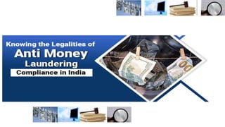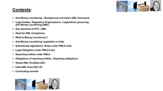 The document discusses anti-money laundering regulations and compliance obligations for financial institutions in India. It covers key topics like the legal framework for AML consisting of the Prevention of Money Laundering Act 2002 and various rules. It describes money laundering processes and the obligations of reporting entities under the act including customer due diligence, record keeping, reporting cash and suspicious transactions to regulators. Global penalties for AML violations in 2021 include a $700 million fine for AmBank in Malaysia and $390 million for Capital One in the US. In India, the number of financial institutions penalized for AML/KYC violations nearly doubled in 2021-22 compared to the previous year.