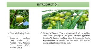 Amla, also known as Indian gooseberry, is a plant species in the family Phyllanthaceae whose dried fruit is used extensively in Ayurveda and herbal medicine. The presentation summarizes the botanical and chemical properties of amla as well as its traditional uses. Key points include that amla contains high levels of vitamin C and gallic acid and is used to treat conditions like heart disease, diabetes, eye health issues, and skin problems. It is a common ingredient in herbal formulations like Chyawanprash and Triphala.