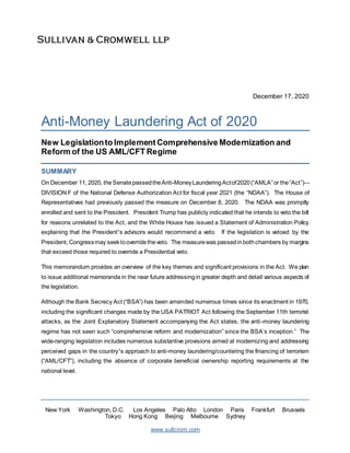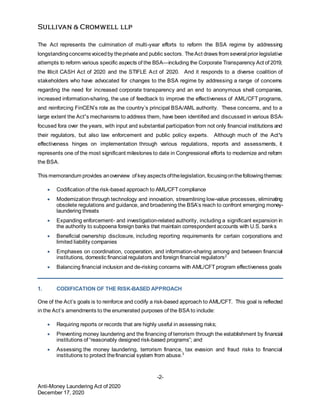 The Anti-Money Laundering Act of 2020 passed the Senate and House and aims to comprehensively reform and modernize the US anti-money laundering regime. If signed into law, it would codify a risk-based approach, modernize regulations through technology, and expand information sharing and beneficial ownership disclosure requirements. However, the President has indicated he may veto the bill and Congress would need to override the veto.