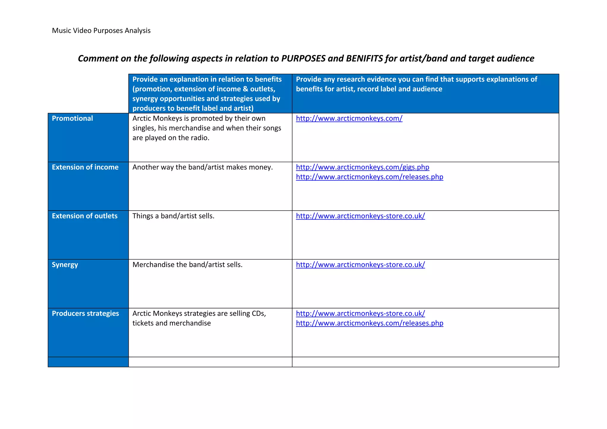 Music videos provide promotional, financial, and strategic benefits for artists, record labels, and audiences. They promote artists by featuring their songs, extending their income through merchandise sales and concerts linked to the videos. Record labels utilize music videos to create synergies between artists' music, visual content, and merchandise to increase profits. Producers employ strategies like Arctic Monkeys' integration of music, tour dates, and store sales across their websites and videos to benefit both the label and band financially and promotionally.