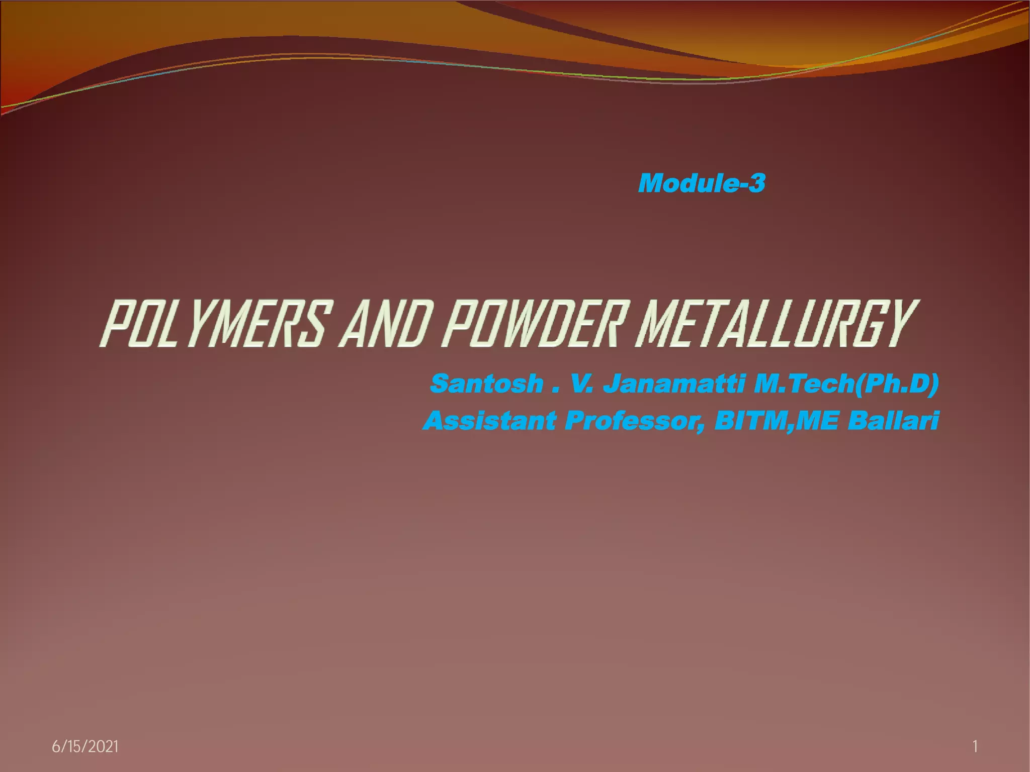 2. The document then covers various topics related to polymers, including classifications of polymers, molecular weight, polymer processing techniques, and metal powder characterization. It provides examples and definitions for these topics.