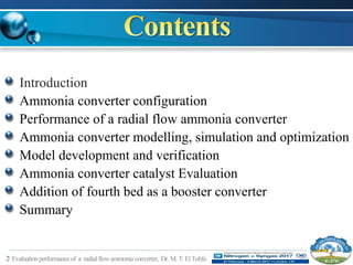 This document describes the development and validation of a mathematical model for a radial flow ammonia converter. The model equations account for material and energy balances across the three catalyst beds. Comparison to plant data from Abu Qir Fertilizers Company showed good agreement between the model and actual performance. The model is useful for optimizing operating conditions, evaluating catalyst performance over time, and determining the effects of adding a fourth catalytic bed.