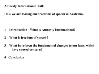 This document discusses freedom of speech in Australia and concerns around recent changes to security laws that could undermine civil liberties. It provides background on Amnesty International and defines freedom of speech as the right to hold opinions without fear of punishment. Recent anti-terrorism laws passed in 2002 are then critiqued for allowing detention without charge, denying access to lawyers, and potentially being used against political dissent rather than just terrorism. The conclusion warns that giving up essential civil liberties in the name of security threatens the very foundations of society.