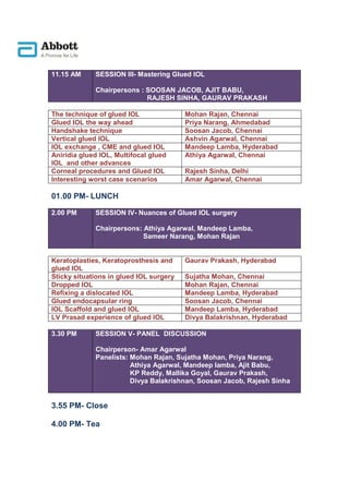 The document outlines the agenda for a conference on glued intraocular lens (IOL) surgery held on March 18th in Hyderabad, India. It includes 5 sessions over the day covering fundamentals, live surgery demonstrations, mastering techniques, nuances, and a panel discussion. Session topics include vitrectomy tips, nucleus drop, sulcus vs glued IOL, fibrin glue, live glued IOL surgery, the handshake technique, vertical glued IOL, IOL exchange and more. Chairpersons and presenters are listed for each session.