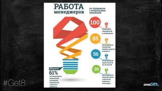Документ описывает услуги компании Get8, партнера интегратора amocrm, предлагающего автоматизацию маркетинга и продаж через интеграции в 15 странах. Он выделяет три ключевых правила работы с CRM и обсуждает инструменты, такие как digital воронки продаж и mail tracking, для повышения конверсии. Компания также предлагает сквозную аналитику и мониторинг для застройщиков.