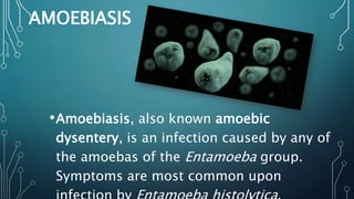 Entamoebiasis, also known as amoebic dysentery, is caused by infection with Entamoeba histolytica. It is transmitted through the fecal-oral route by consuming contaminated food or water or through direct contact. Symptoms include abdominal cramps, diarrhea, fatigue and tenderness. Diagnosis involves examining stool samples under a microscope to look for trophozoites. Treatment involves antibiotics like metronidazole or iodoquinol to kill the parasites. Prevention focuses on proper sanitation, safe water supplies, and hygiene practices to avoid fecal contamination.