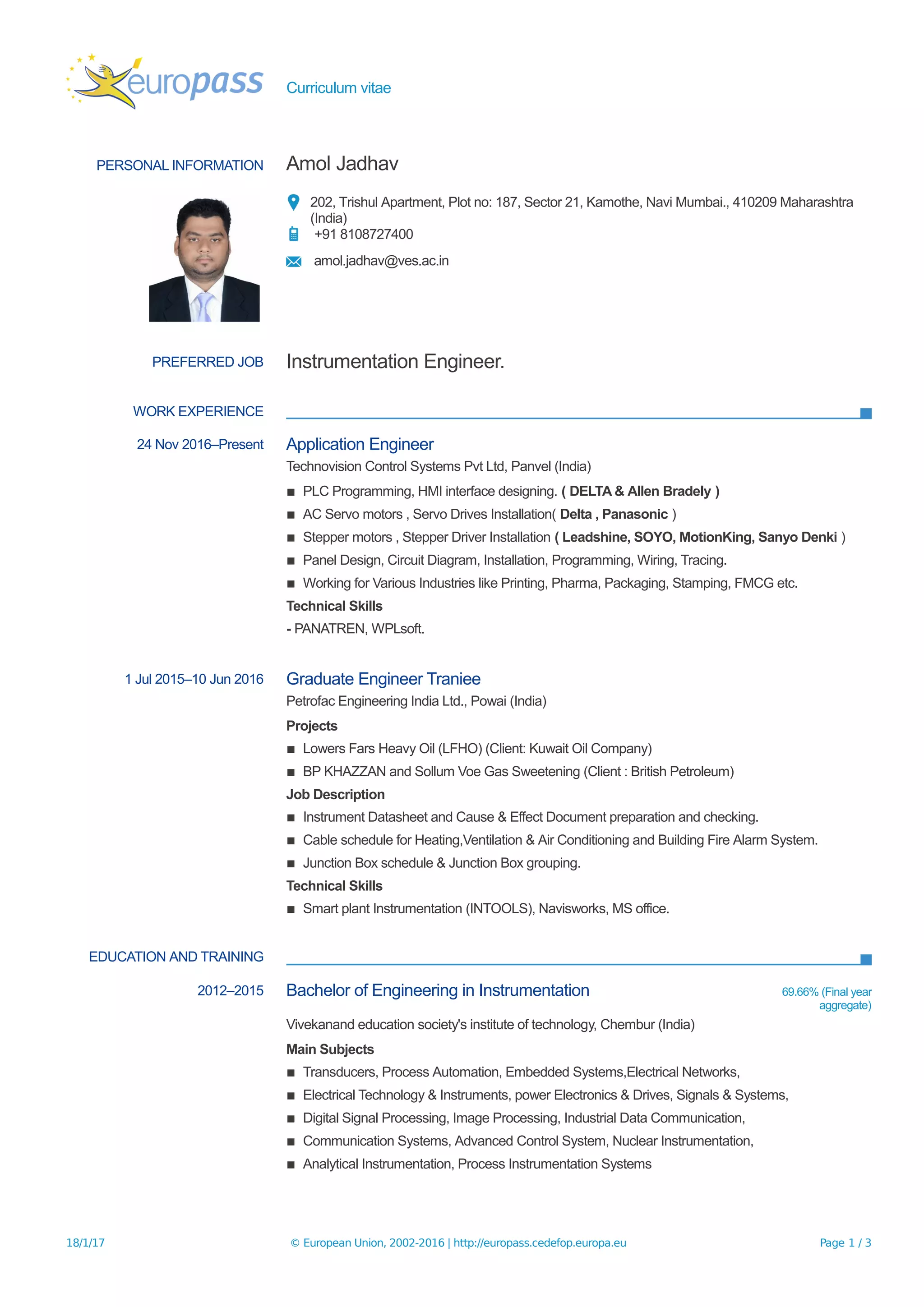 Amol Jadhav is an instrumentation engineer with over 2 years of experience in PLC programming, HMI interface design, motor installation, and panel design. He holds a Bachelor's degree in Instrumentation Engineering and worked as a graduate engineer trainee at Petrofac Engineering India. He is proficient in English, has strong communication and organizational skills, and is interested in automation, robotics, and embedded systems.