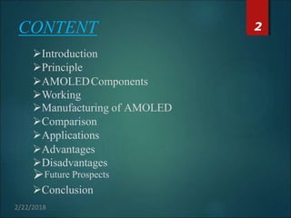 The document provides an overview of Active Matrix Organic Light Emitting Diode (AMOLED) technology, detailing its components, working principles, manufacturing processes, and comparisons to other display technologies. It discusses applications such as mobile phones, TVs, and tablets, along with advantages like flexibility and lower power consumption, and disadvantages like limited lifetime and complex manufacturing. Future prospects include advancements like curved and transparent AMOLED displays, indicating the potential for widespread replacement of current LED and LCD technologies.