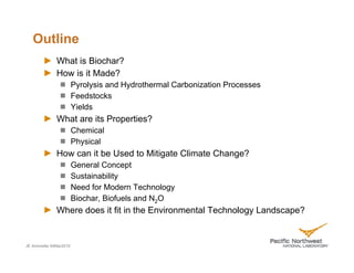 This document provides an overview of biochar, a solid product derived from the thermal degradation of biomass, detailing its production methods, properties, and potential uses in climate change mitigation. Key production techniques include slow pyrolysis, fast pyrolysis, gasification, and hydrothermal carbonization, each affecting yield and stability differently. The document emphasizes biochar's role in enhancing soil fertility, reducing greenhouse gas emissions, and improving nutrient retention, while also outlining sustainability criteria for its production.