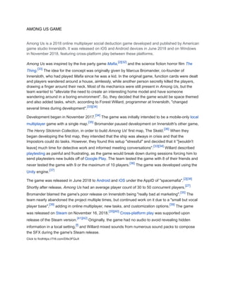 Among Us is a 2018 online multiplayer social deduction game where players complete tasks on a spaceship while secret impostors try to sabotage the ship and kill other players without being discovered. The game was inspired by the party game Mafia and takes place on a spaceship instead of in a home to make gameplay more interesting. It was initially intended to be a mobile-only local multiplayer game but received an online multiplayer update after gaining a small but dedicated fan base, which helped the game succeed on Steam.