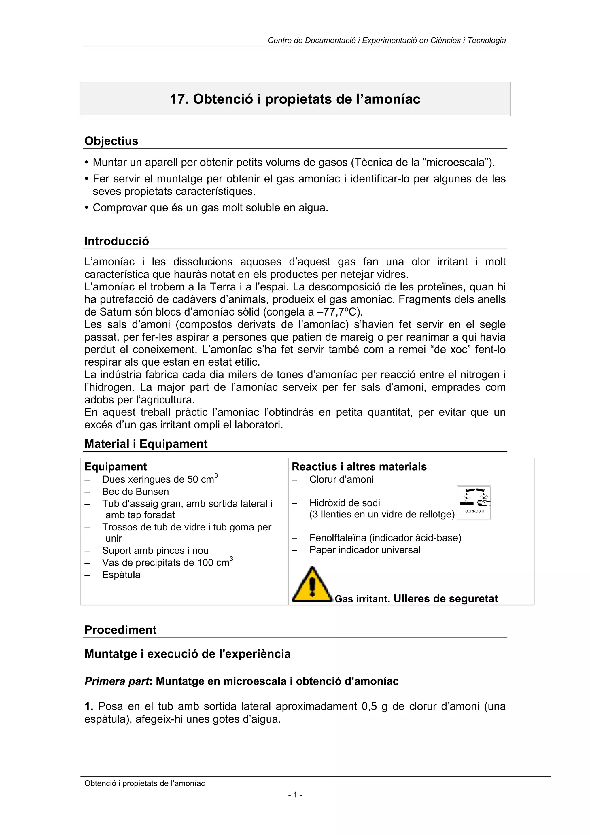 En aquest treball pràctic l’amoníac l’obtindràs en petita quantitat, per evitar que un