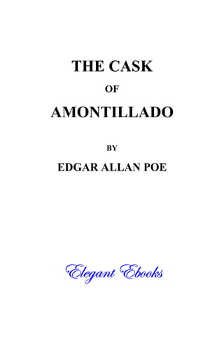 This document provides a summary of Edgar Allan Poe's short story "The Cask of Amontillado". It notes that the story, published in 1846, is in the public domain. It was created as a PDF ebook by José Menéndez. The summary then provides a brief synopsis of the plot in 3 sentences: The story is about a man named Montresor who seeks revenge on Fortunato for some insult, and lures Fortunato into his wine cellar under the guise of evaluating a wine, where he then bricks Fortunato alive within the walls.