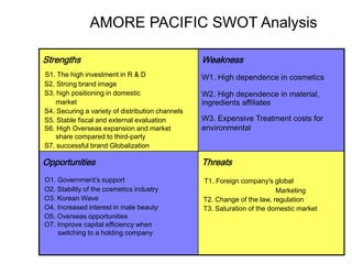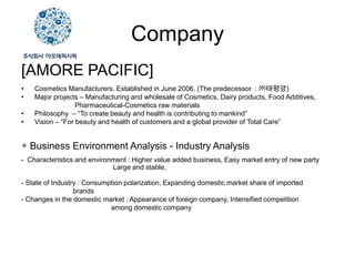 The document summarizes information about Amore Pacific, a South Korean cosmetics manufacturer. It provides details about the company's philosophy, vision, business environment, SWOT analysis, and marketing mix (4Ps). The SWOT analysis identifies strengths such as R&D investment and brand image, weaknesses like high material costs, opportunities like government support, and threats like increased foreign competition. The 4Ps section covers Amore Pacific's product differentiation, pricing strategy, promotional activities, and distribution channels. A BCG matrix classifies the company's divisions.