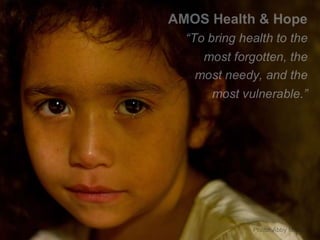 Amos Health and Hope is a Christian non-profit organization focused on improving the health of impoverished communities through health, education, and development initiatives. They empower local leaders to provide essential healthcare and train communities on preventive health practices, addressing issues such as malnutrition and lack of clean water. Their model promotes equity and integral health, ensuring that the most vulnerable individuals are identified and cared for effectively.