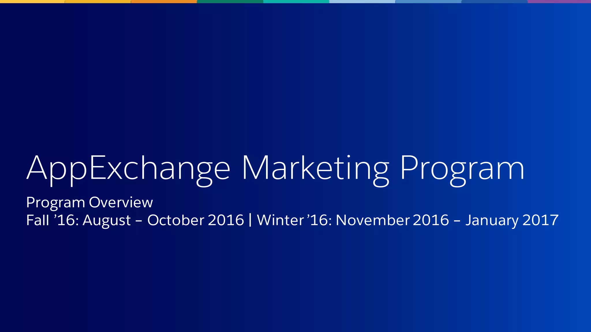 The AppExchange Marketing Program provides turnkey joint marketing campaigns between Salesforce and its partners. The Fall 2016 campaign will focus on showcasing apps that Salesforce admins love through promotions, content and social media from August to October. The Winter 2016 campaign will highlight accelerator apps for small businesses from November 2016 to January 2017. The program offers various package options for partners to generate awareness, leads and growth through AppExchange.