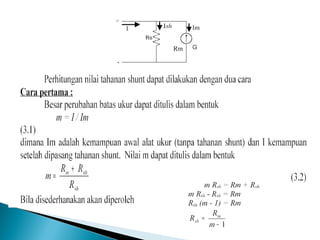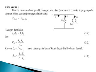 Dokumen ini membahas tentang ampermeter DC, termasuk penggunaan tahanan shunt untuk mengukur arus besar dan perubahan batas ukur dengan tahanan shunt paralel. Selain itu, dijelaskan tentang pengaruh suhu terhadap alat ukur dan solusi untuk mengatasi masalah tersebut, serta konsep shunt Ayrton yang memungkinkan variasi batas ukur dengan beberapa tahanan shunt. Rangkaian shunt Ayrton dirancang untuk menjaga agar alat ukur tidak digunakan tanpa tahanan shunt yang tepat.