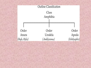 Amphibians like frogs, toads, newts, and salamanders are characterized as having two pairs of limbs, lungs for aerial respiration in addition to aquatic respiration through their skin, a three-chambered heart, and indirect development where young possess gills before metamorphosing into adults. They have smooth, glandular skin without scales except in caecilians, and pentadactyl limbs without claws. Amphibians exhibit traits that fall between fully aquatic and terrestrial vertebrates.