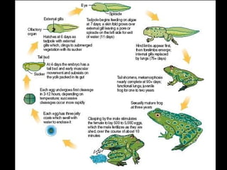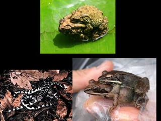 Class Amphibia includes over 5,400 species of caecilians, salamanders, frogs, and toads that typically live near water. Many amphibian species are threatened due to habitat loss and other causes. Amphibians have permeable skin that aids respiration and protection, and powerful hind legs that allow them to leap long distances.