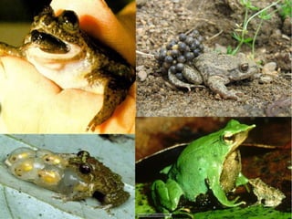 Amphibians were the first vertebrates to adapt to living on land, though most still require water for reproduction or parts of their life cycle. They have moist skin, minimal teeth, and undergo metamorphosis from aquatic tadpoles to terrestrial adults. While tadpoles are herbivorous, most adult amphibians are carnivorous. They have complex life cycles and come in three main types: anures without tails, urodels with tails, and legless gymnophions.