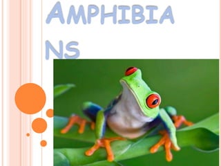 Amphibians evolved from fish during the Devonian period and diversified during the Carboniferous period. They undergo metamorphosis from an aquatic larval stage to a terrestrial adult stage. Amphibians have a three-chambered heart, lungs for respiration, and porous skin that also aids gas exchange. They reproduce through external fertilization, with the eggs developing into larvae that breathe through gills before transforming into air-breathing adults. The major orders of amphibians are salamanders, frogs and toads, and caecilians.