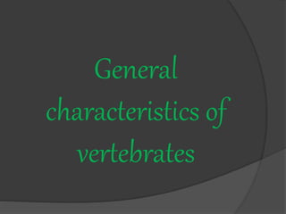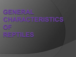 Vertebrates are characterized by having a well-developed brain and nervous system, an internal skeleton made of bone and cartilage, and the ability to live on land, in water, or air. They are heterotrophic, have respiratory and circulatory systems, protective skin, and bilateral symmetry. Reptiles are a group of vertebrates that are cold-blooded, have scales and lay eggs, do not require much food, and usually have four limbs.